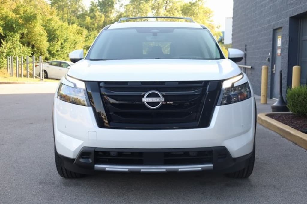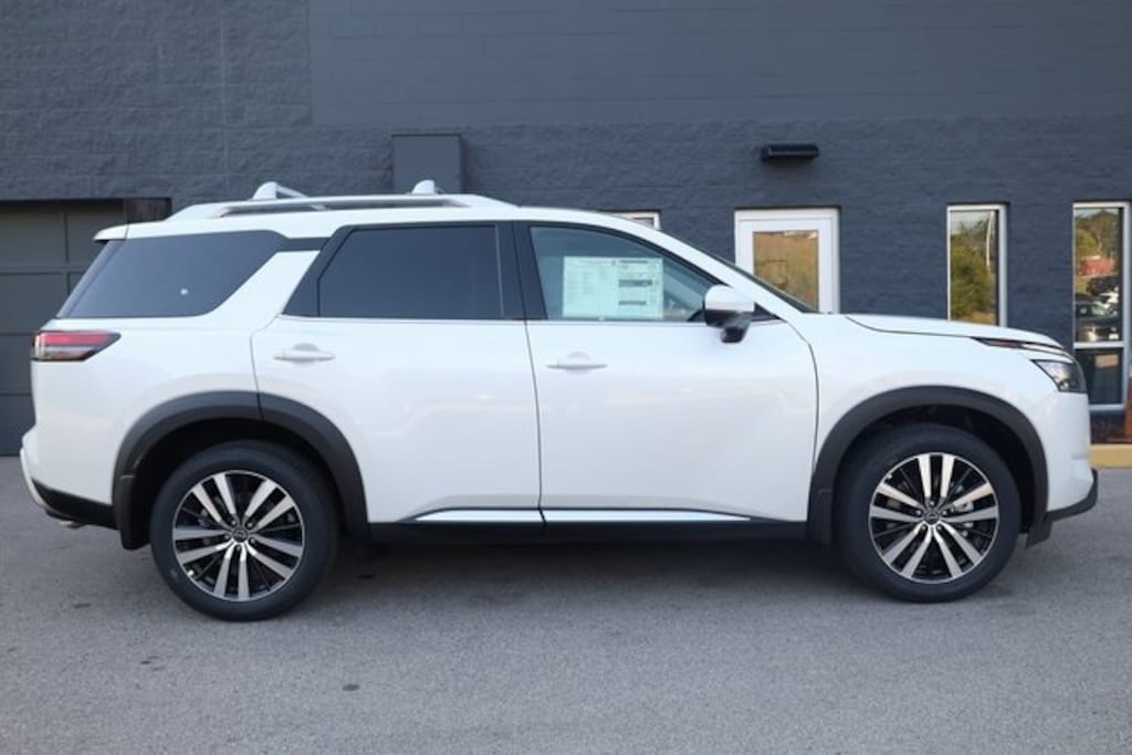 This Pathfinder is well equipped with Black Appearance Package (Black Grille and Black Liftgate Emblems), Cargo Package (Cargo Area Protector, Cargo Net, and First Aid), 4WD, 13 Speakers, 3rd row seats: bench, 4-Wheel Disc Brakes, ABS brakes, Air Conditioning, Alloy wheels, AM/FM radio: SiriusXM, Auto High-beam Headlights, Auto tilt-away steering wheel, Auto-dimming Rear-View mirror, Automatic temperature control, Bench Seat Carpeted Floor Mats (Set of 4), Bodyside moldings, Bose Premium Audio System, Brake assist, Bumpers: body-color, Climate Controlled Front Bucket Seats, Cross Bars, Delay-off headlights, Driver door bin, Driver vanity mirror, Dual front impact airbags, Dual front side impact airbags, Electronic Stability Control, Emergency communication system, Exterior Parking Camera Rear, Four wheel independent suspension, Front anti-roll bar, Front Bucket Seats, Front Center Armrest, Front dual zone A/C, Front reading lights, Fully automatic headlights, Garage door transmitter: HomeLink, Heads-Up Display, Heated door mirrors, Heated front seats, Heated rear seats, Heated steering wheel, Illuminated entry, Knee airbag, Leather steering wheel, Low tire pressure warning, Memory seat, Navigation system: NissanConnect with Navigation and Services, Nissan Connect featuring Apple CarPlay and Android Auto, NissanConnect w/Navigation & Services, Occupant sensing airbag, Outside temperature display, Overhead airbag, Overhead console, Panic alarm, Passenger door bin, Passenger vanity mirror, Power door mirrors, Power driver seat, Power Liftgate, Power moonroof, Power passenger seat, Power steering, Power windows, Premium Paint, Radio data system, Radio: AM/FM Audio System, Rain sensing wipers, Rear air conditioning, Rear anti-roll bar, Rear reading lights, Rear seat center armrest, Rear side impact airbag, Rear window defroster, Rear window wiper, Reclining 3rd row seat, Remote keyless entry, Security system, Semi-Aniline Leather-Appointed Seating Surfaces, Speed control, Speed-sensing steering, Speed-Sensitive Wipers, Split folding rear seat, Spoiler, Steering wheel memory, Steering wheel mounted audio controls, Tachometer, Telescoping steering wheel, Tilt steering wheel, Traction control, Trip computer, Turn signal indicator mirrors, Variably intermittent wipers, Ventilated front seats, and Wheels: 20" x 8J Machined Alloy.