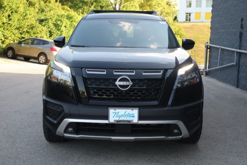 This Pathfinder is well equipped with 4WD, 3rd row seats: bench, 4-Wheel Disc Brakes, 6 Speakers, ABS brakes, Air Conditioning, Alloy wheels, AM/FM radio: SiriusXM, Auto High-beam Headlights, Automatic temperature control, Black Splash Guards (Set of 4), Brake assist, Delay-off headlights, Driver door bin, Driver vanity mirror, Dual front impact airbags, Dual front side impact airbags, Electronic Stability Control, Emergency communication system, Four wheel independent suspension, Front anti-roll bar, Front Bucket Seats, Front Center Armrest, Front dual zone A/C, Front fog lights, Front reading lights, Fully automatic headlights, Heated door mirrors, Heated Front Bucket Seats, Heated front seats, Illuminated entry, Knee airbag, Leather steering wheel, Leatherette-Appointed Seating Surfaces, Low tire pressure warning, Nissan Connect featuring Apple CarPlay and Android Auto, Occupant sensing airbag, Outside temperature display, Overhead airbag, Overhead console, Panic alarm, Passenger door bin, Passenger vanity mirror, Power door mirrors, Power driver seat, Power Liftgate, Power steering, Power windows, Radio data system, Radio: AM/FM Audio System w/NissanConnect, Rear air conditioning, Rear anti-roll bar, Rear Parking Sensors, Rear reading lights, Rear side impact airbag, Rear window defroster, Rear window wiper, Reclining 3rd row seat, Remote keyless entry, Rock Creek AS Floor Liners & Cargo Area Protector, Roof rack, Security system, Speed control, Speed-sensing steering, Split folding rear seat, Spoiler, Steering wheel mounted audio controls, Tachometer, Telescoping steering wheel, Tilt steering wheel, Traction control, Trip computer, Turn signal indicator mirrors, Variably intermittent wipers, and Wheels: 18" x 8J Machined Alloy w/Black Finish.