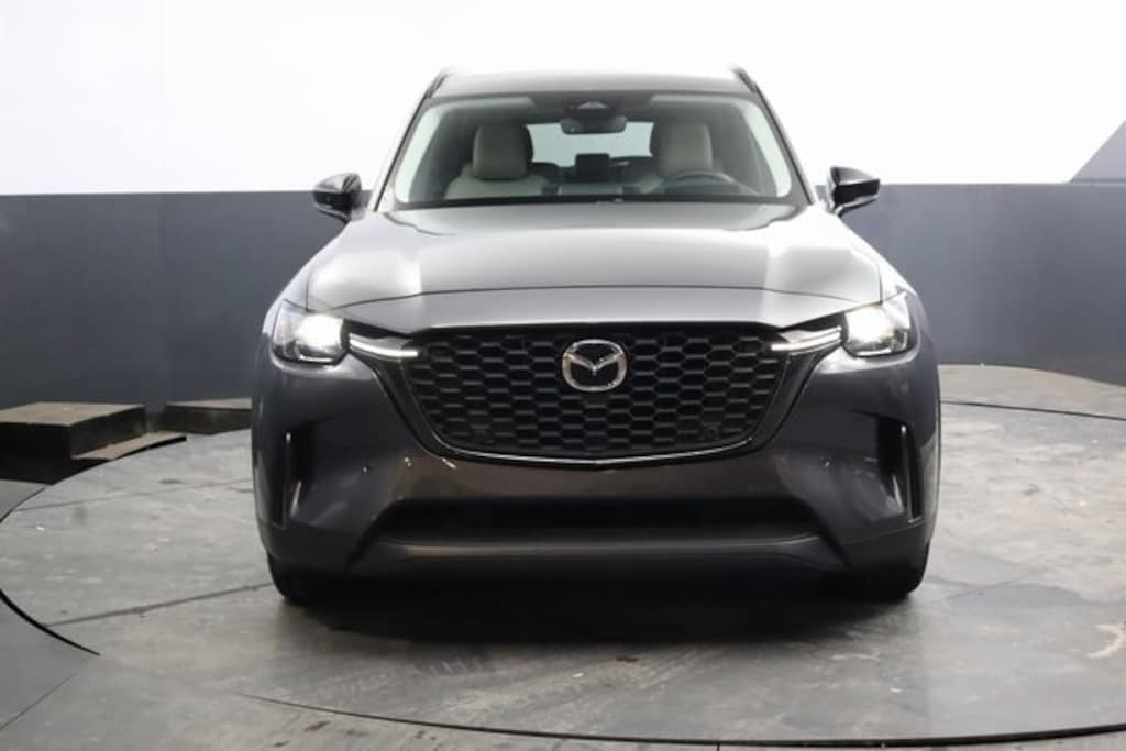 This Mazda CX-90 is well equipped with 12 Speakers, 2nd-Row Captain's Chairs, 3rd row seats: bench, 4-Wheel Disc Brakes, ABS brakes, Air Conditioning, Alloy wheels, AM/FM radio: SiriusXM, Auto High-beam Headlights, Auto-dimming Rear-View mirror, Automatic temperature control, Brake assist, Bumpers: body-color, Compass, Delay-off headlights, Driver door bin, Driver vanity mirror, Dual front impact airbags, Dual front side impact airbags, E911 Automatic Emergency Notification, Electronic Stability Control, Emergency communication system: MAZDA CONNECT, Exterior Parking Camera Rear, Four wheel independent suspension, Front anti-roll bar, Front Bucket Seats, Front Center Armrest w/Storage, Front dual zone A/C, Front reading lights, Fully automatic headlights, Garage door transmitter: HomeLink, Heads-Up Display, Heated door mirrors, Heated Front Bucket Seats, Heated front seats, Illuminated entry, Infotainment System Voice Command, Knee airbag, Leather Seat Trim, Leather Shift Knob, Leather steering wheel, Low tire pressure warning, Machine Gray Metallic Paint Charge, Mazda Connected Services, Mazda Navigation System, Memory seat, Navigation system: MAZDA CONNECT, Occupant sensing airbag, Outside temperature display, Overhead airbag, Overhead console, Pandora Internet Radio Integration, Panic alarm, Passenger door bin, Passenger vanity mirror, Power door mirrors, Power driver seat, Power Liftgate, Power moonroof, Power passenger seat, Power steering, Power windows, Radio Broadcast Data System Program Information, Radio data system, Radio: AM/FM w/HD/Bose 12-Speaker Sound System, Rain sensing wipers, Rear air conditioning, Rear anti-roll bar, Rear reading lights, Rear seat center armrest, Rear window defroster, Rear window wiper, Remote keyless entry, SMS Text Msg Audio Delivery & Reply, Speed control, Speed-sensing steering, Split folding rear seat, Spoiler, Steering wheel mounted audio controls, Tachometer, Telescoping steering wheel, Tilt steering wheel, Traction control, Trip computer, Turn signal indicator mirrors, Variably intermittent wipers, and Wheels: 21" x 9.5J Aluminum Alloy.