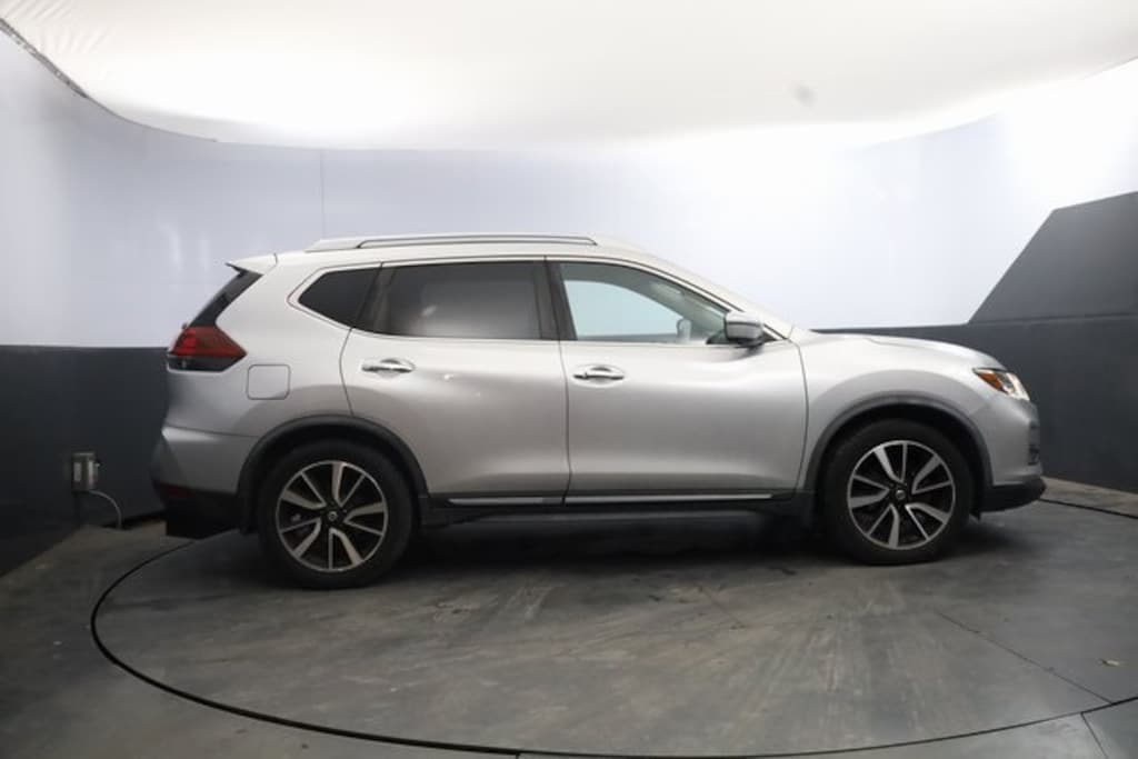 This Rogue is well equipped with 18" Alloy Wheels, 4-Wheel Disc Brakes, 6.386 Axle Ratio, 9 Speakers, ABS brakes, Air Conditioning, Alloy wheels, AM/FM radio: SiriusXM, Anti-whiplash front head restraints, Apple CarPlay/Android Auto, Auto High-beam Headlights, Auto-dimming Rear-View mirror, Automatic temperature control, Blind Spot Warning, Brake assist, Bumpers: body-color, CD player, Delay-off headlights, Driver door bin, Driver vanity mirror, Dual front impact airbags, Dual front side impact airbags, Electronic Stability Control, Emergency communication system: NissanConnect Services, Four wheel independent suspension, Front anti-roll bar, Front Bucket Seats, Front Center Armrest w/Storage, Front dual zone A/C, Front fog lights, Front reading lights, Fully automatic headlights, Garage door transmitter: HomeLink, Heated door mirrors, Heated front seats, Heated steering wheel, Illuminated entry, Leather Appointed Seat Trim, Leather Shift Knob, Low tire pressure warning, Memory seat, Navigation System, Occupant sensing airbag, Outside temperature display, Overhead airbag, Overhead console, Panic alarm, Passenger door bin, Passenger vanity mirror, Power door mirrors, Power driver seat, Power Liftgate, Power steering, Power windows, Quick Comfort Heated Front Bucket Seats, Radio data system, Radio: AM/FM/CD/AUX NissanConnect w/Navigation, Rear anti-roll bar, Rear seat center armrest, Rear window defroster, Rear window wiper, Remote keyless entry, Roof rack: rails only, Security system, Speed control, Speed-sensing steering, Split folding rear seat, Spoiler, Steering wheel mounted audio controls, Tachometer, Telescoping steering wheel, Tilt steering wheel, Traction control, Trip computer, Turn signal indicator mirrors, and Variably intermittent wipers.