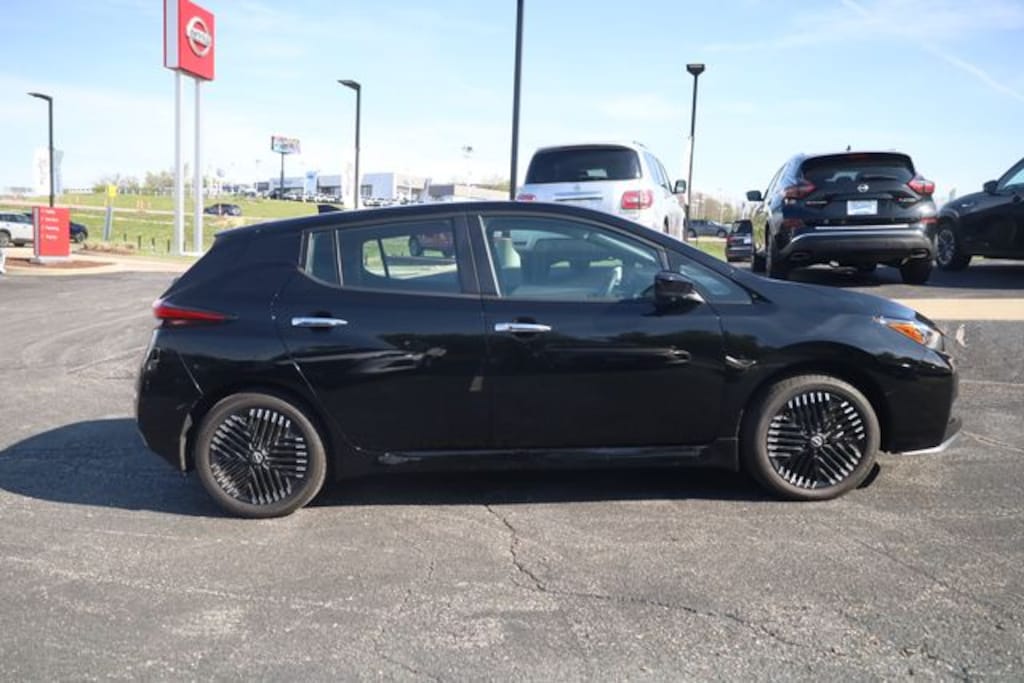 This Leaf is well equipped with 4-Wheel Disc Brakes, 6 Speakers, ABS brakes, Air Conditioning, Alloy wheels, AM/FM radio: SiriusXM, Auto High-beam Headlights, Auto-dimming Rear-View mirror, Automatic temperature control, Brake assist, Bumpers: body-color, Carpeted Floor Mats and Cargo Area Mat, Cloth Seat Trim, Delay-off headlights, Driver door bin, Driver vanity mirror, Dual front impact airbags, Dual front side impact airbags, Electronic Stability Control, Emergency communication system: NissanConnect Services, Front anti-roll bar, Front Bucket Seats, Front Center Armrest, Front fog lights, Front reading lights, Front wheel independent suspension, Fully automatic headlights, Heated door mirrors, Heated Front Bucket Seats, Heated front seats, Heated steering wheel, Illuminated entry, Kick Plates, Knee airbag, Leather steering wheel, Low tire pressure warning, Navigation system: NissanConnect EV w/Navigation & Services, Nissan Connect featuring Apple CarPlay and Android Auto, NissanConnect Services Powered by SiriusXM, Occupant sensing airbag, Outside temperature display, Overhead airbag, Overhead console, Panic alarm, Passenger door bin, Passenger vanity mirror, Power door mirrors, Power driver seat, Power steering, Power windows, Radio data system, Radio: NissanConnect EV Audio with Navigation and SiriusXM, Rear anti-roll bar, Rear Cupholders and Stash Tray, Rear Parking Sensors, Rear side impact airbag, Rear window defroster, Rear window wiper, Remote keyless entry, Safety Kit, Security system, Siri Eyes Free, Speed control, Speed-sensing steering, Splash Guards, Split folding rear seat, Spoiler, Steering wheel mounted audio controls, Telescoping steering wheel, Tilt steering wheel, Traction control, Trip computer, USB Charging Cable Set, Variably intermittent wipers, and Wheels: 17" Machined Finish Aluminum Alloy.