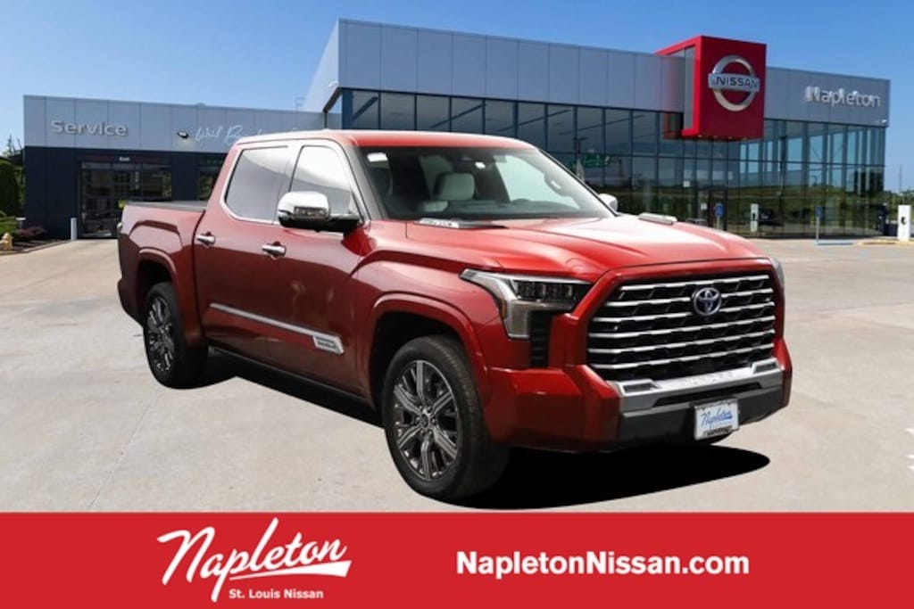 This Tundra Hybrid is well equipped with 3.4L V6, 12 Speakers, 3.31 Axle Ratio, 4-Wheel Disc Brakes, ABS brakes, Air Conditioning, Alloy wheels, AM/FM radio: SiriusXM, Apple CarPlay/Android Auto, Auto High-beam Headlights, Auto-dimming door mirrors, Auto-dimming Rear-View mirror, Automatic temperature control, Brake assist, Bumpers: body-color, Compass, Delay-off headlights, Driver door bin, Driver vanity mirror, Dual front impact airbags, Dual front side impact airbags, Electronic Stability Control, Emergency communication system: Safety Connect (10-year trial), Front anti-roll bar, Front Bucket Seats, Front Center Armrest, Front dual zone A/C, Front fog lights, Front reading lights, Front wheel independent suspension, Fully automatic headlights, Garage door transmitter: HomeLink, Heads-Up Display, Heated & Ventilated Front Bucket Seats, Heated door mirrors, Heated front seats, Heated rear seats, Heated steering wheel, Illuminated entry, Knee airbag, Leather Shift Knob, Low tire pressure warning, Memory seat, Navigation System, Occupant sensing airbag, Outside temperature display, Overhead airbag, Overhead console, Panic alarm, Passenger door bin, Passenger vanity mirror, Power door mirrors, Power driver seat, Power moonroof, Power passenger seat, Power steering, Power windows, Radio data system, Radio: Premium Audio w/JBL, Rain sensing wipers, Rear reading lights, Rear seat center armrest, Rear step bumper, Rear window defroster, Remote keyless entry, Security system, Semi-Aniline Leather Seat Trim, Speed control, Speed-sensing steering, Split folding rear seat, Steering wheel memory, Steering wheel mounted audio controls, Tachometer, Telescoping steering wheel, Tilt steering wheel, Traction control, Trip computer, Turn signal indicator mirrors, Variably intermittent wipers, Ventilated front seats, Ventilated rear seats, Voltmeter, and Wheels: 22" Dark Chrome Alloy.